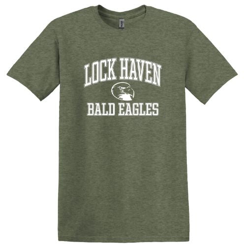 CH Short Sleeve T-Shirt with Lock Haven Bald Eagles Screen Print. This Heathered Tee is 50% Cotton and 50% Polyester.